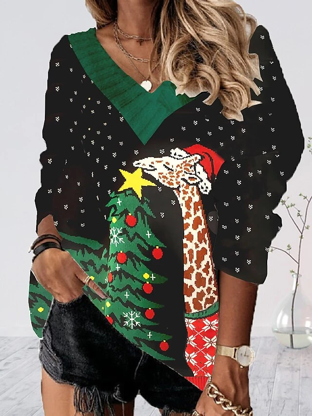 Women’s Ugly Christmas Sweater Pullover Sweater Jumper V Neck Ribbed Knit Polyester Patchwork Fall Winter Regular Outdoor Xmas Holiday Stylish Casual Soft Long Sleeve Animal Christmas Tree Print