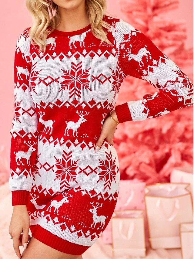 Women’s Ugly Christmas Sweater Sweater Dress Christmas Sweaters Crew Neck Ribbed Knit Polyester Knitted Fall Winter Long Outdoor Christmas Daily Stylish Casual Soft Long Sleeve Elk Snowflake Red S M L