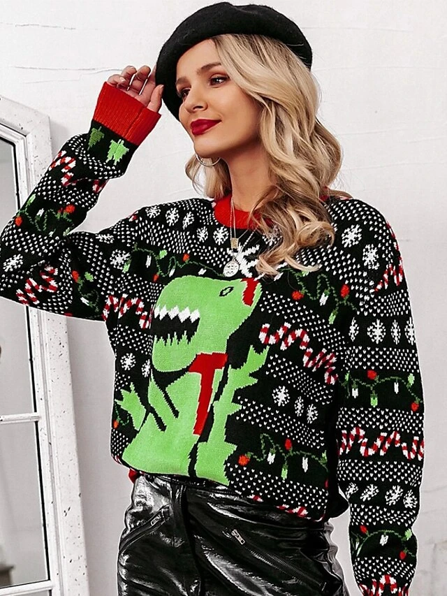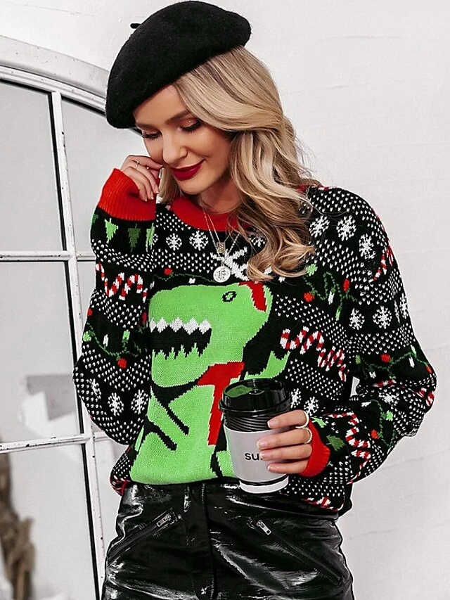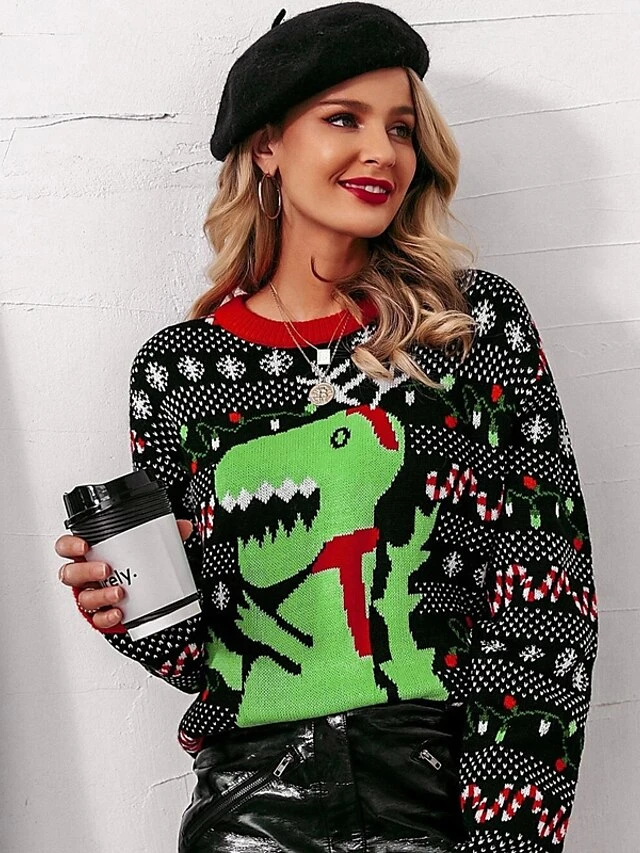 Women’s Ugly Sweater Jumper Crew Neck Knit Acrylic Knitted Fall Winter Christmas Daily Holiday Xmas Stylish Casual Long Sleeve Animal Snowflake Black S M L