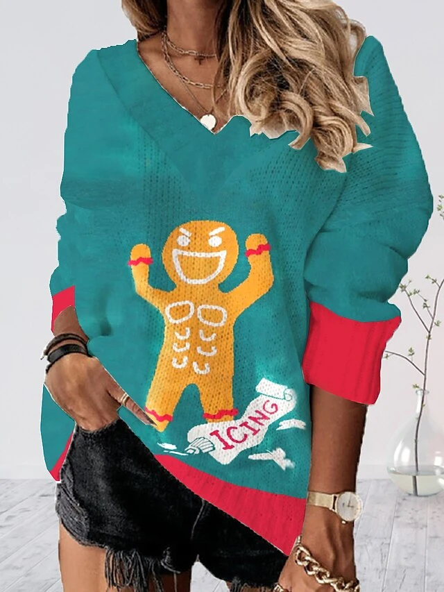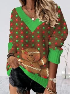 Women’s Ugly Xmas Sweater Pullover Sweater Jumper Crochet Knit Regular Print Polka Dot V Neck Stylish Casual Christmas Drop Shoulder Fall Winter Green Khaki S M L