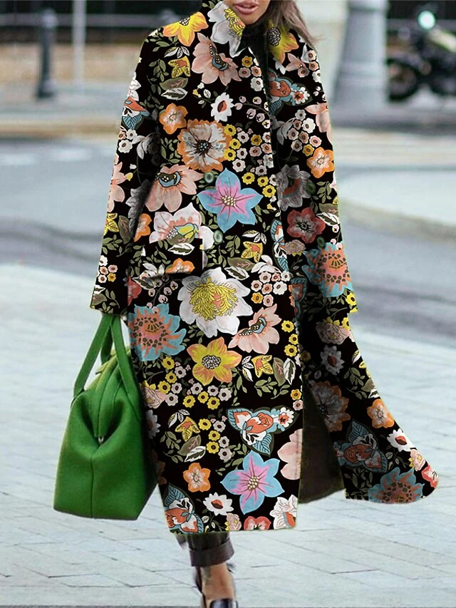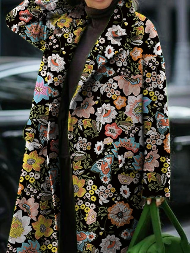 Women’s Winter Coat Coat Windproof Warm Holiday Daily Wear Weekend Button Pocket Double Breasted Lapel Vintage Daily Christmas Floral Regular Fit Outerwear Long Sleeve Fall Winter Black Green S M L