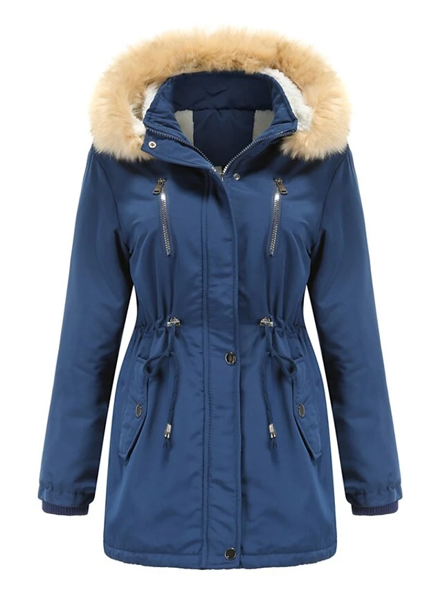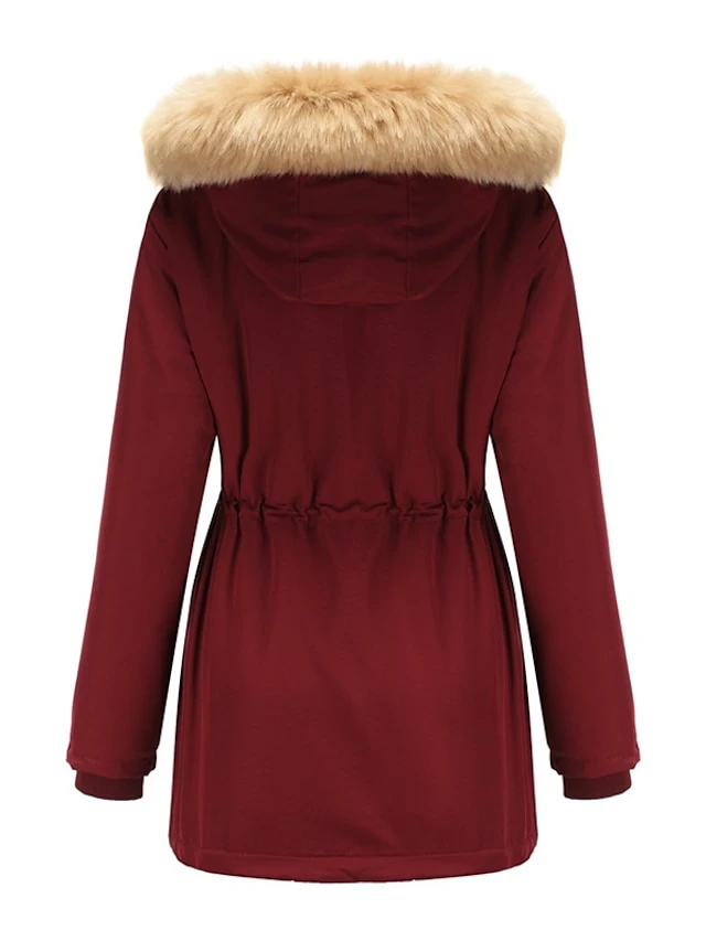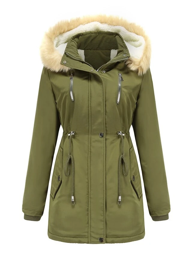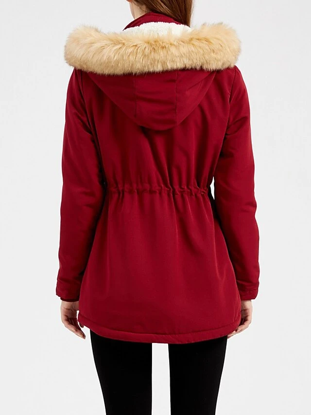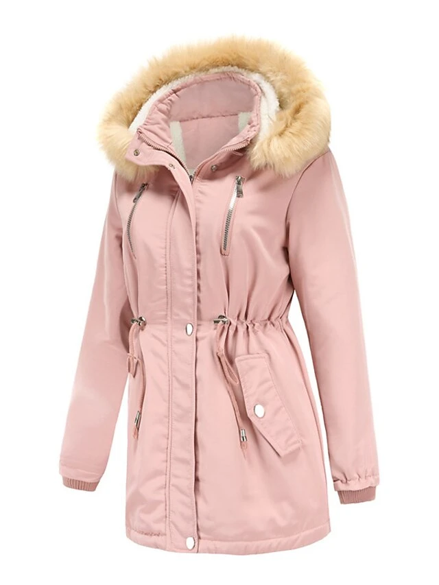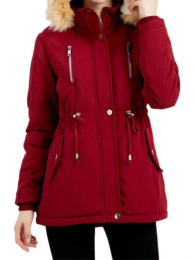 Women’s Winter Coat Jacket Parka Warm Breathable Outdoor Christmas Daily Wear Vacation Xmas Pocket Fur Collar Fleece Lined Zipper Hoodie Elegant Lady Comfortable Solid Color Regular Fit Outerwear