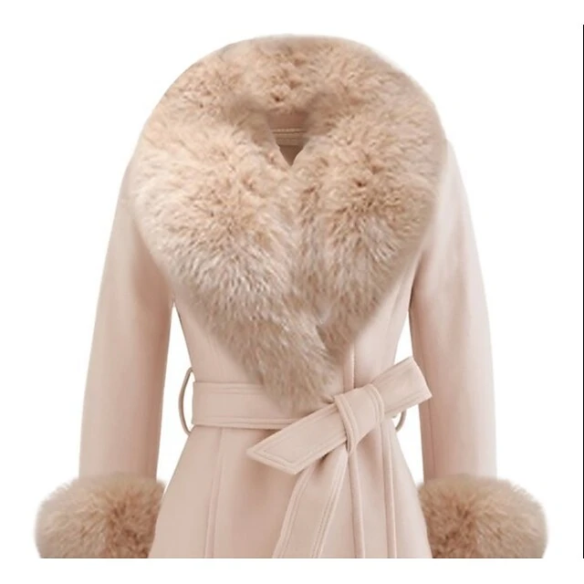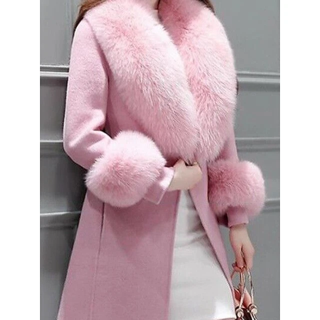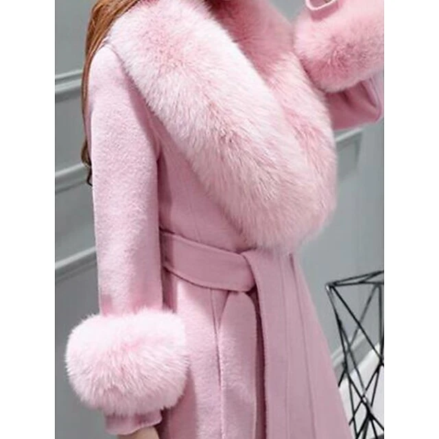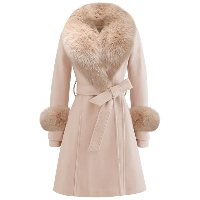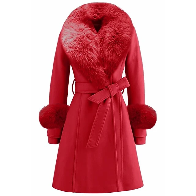 Women’s Winter Coat Long Overcoat With Faux Fur Wool Blend Belted Dress Coat Open Front Lapel Pea Coat Fall Elegant Lady Jacket Christmas Party Xmas Outerwear Pink Red
